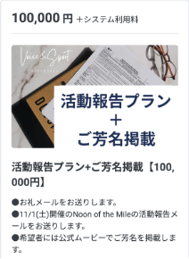 ご支援いただいた方全員に、Noon of the Mileの活動報告レポートを送付させていただきます。また、1万円以上ご寄付いただいた方のご芳名を大会公式ムービーに表示いたします。